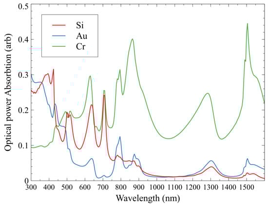 Figure 3 shows that for the NIR spectrum, silicon and gold perform rather poorly with absorbed power being less than 0.1 for the 850 nm wavelength; absorption in silicon is slightly larger compared to gold. The Cr block layer, however, shows large power absorption for the NIR and IR range; this is due to the Cr layer forming a resonant cavity layer between the Si grating and the Au metal contact. At the 850 nm wavelength, the total optical power absorbed in the Si, Au, and Cr layers is 0.055, 0.044, and 0.377, with absorption in the Cr layer being the highest. It is also interesting to see that Cr has Pabs of 0.11 at 1050 nm and 0.41 Pabs at 1500 nm, which means that this structure can also be used for the photodetector at these communication wavelengths.