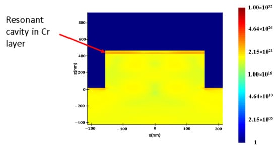 A resonant cavity formed in the Cr layer results in more optical power being absorbed in the Cr. Figure 4 shows the location of the resonant cavity which is coincident with the location of the Cr layer. The location for the peak optical power absorption is in the Cr metal layer, which is sandwiched between Au and Si, and at the valley Au layer, which is used for the MACE catalyst. However, the valley Au metal layer is not directly connected to electrical electrodes; hence, it does not contribute to the overall electrical characteristics. The band diagram of the Cr/Si Schottky contacts and IPE effect mechanism is shown in Figure 5. Light which is absorbed into the Cr layer will result in the creation of hot electrons which will be injected into the Si grating structure.