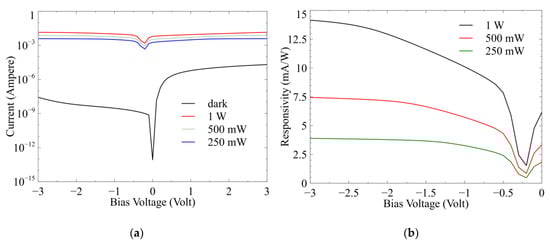 From Figure 3, we can see the photovoltaic characteristics at zero bias in which a photocurrent of 6.1 mA is flowing in the device for 1 watt of optical power. For an operating voltage of −1 volt, the lowest dark current is 2.9 nA, and the maximum light current is 10.1 mA, 5.7 mA, and 3.2 mA for optical powers of 1 watt, 500 mW, and 250 mW, respectively. By using the DC steady-state data, we can calculate device responsivity by using the formula R = (Ilight − Idark)/source power, and the result is shown in Figure 6b.