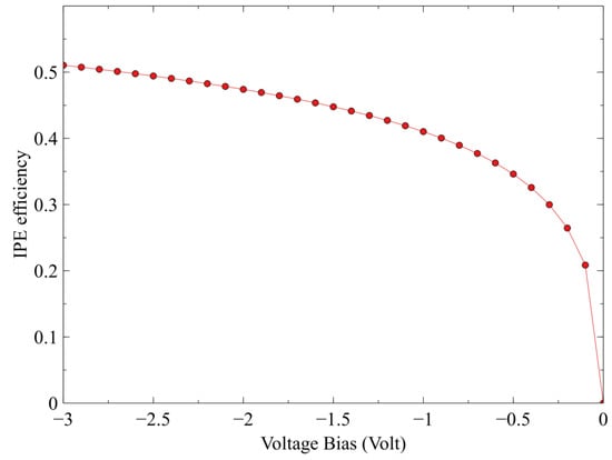 For the IPE efficiency for the chromium metal layer, we set chromium ϕm = 4.6 eV, and Le = 19 nm. Since the IPE effect is only valid for reverse bias conditions (forward bias will result in zero efficiencies), we set the sweep voltage as the calculation from 0 to −3 volt, and the result is shown in Figure 7. The IPE effect efficiency increases as the reverse voltage increases; this is because of the barrier-lowering effect on the Schottky barrier between chromium and silicon due to the mirror charge in the chromium–silicon interface.