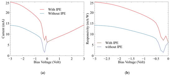 Electrical characteristic with IPE effect included. (a) IV characteristic of the device with light current for photocurrent without IPE and photocurrent with IPE, (b) responsivity comparison with and without IPE effect.