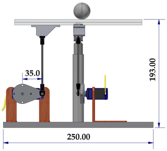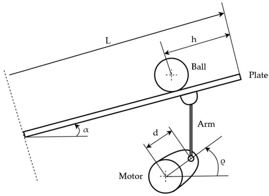 Simplifications were made on the mathematical model of the physical system, such that the displacements of the ball in the X and Y directions on the table are considered independent of each other, so the movement in the X and Y directions can be modeled independently and identically. In the simplified one-dimensional model, the table is positioned using a servo motor, such that one end of an arm is attached to the servo motor and the other one to the table. In this model, the ball can only move along one line, therefore the degree of freedom of the system is one [30], as illustrated in Figure 2.
