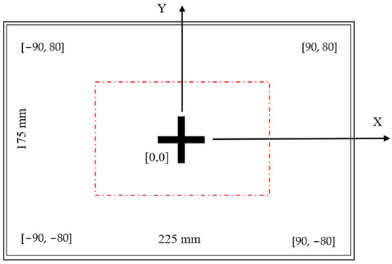 The analog inputs of Arduino are 4 wires, each for one connection. It uses connections A1 and A3 as outputs, and connections A0 and A2 as inputs. Thus, when the position of the ball changes on the table, the resistance of the panel changes in proportion with it, this way modifying the output voltage. The panel acts as a voltage divider. To read the position, we fitted the coordinate system according to Figure 6 to obtain the coordinates in the Arduino program. The entire range is divided into 256 units in both the X and Y axes, and then the obtained value is shifted by 128, such that the center of the coordinate system is in the geometric center of the panel [33].