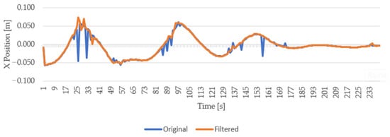 Filtering was applied on the ball position raw measurements to cope with noisy inputs and also to obtain speed estimates which served as additional input to the neural network agent. Two types of filters, Kálmán filter and a simple linear regression-based filter were tested, we obtained better results with the latter one. In case of linear regression, we considered position measurements of the last 0.2 s (~40 measurements with position measurement frequency of 200 Hz). After fitting, outlier measurements (with deviation greater than two times of the average deviation) were ignored, and a new line was fitted on the remaining points. The effect of this filtering approach is demonstrated in Figure 8.