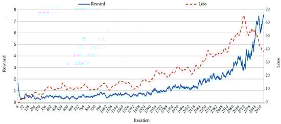 To train the agent, we collected experiences by running trials of length 6 s (120 time-steps). After each trial, the neural network was updated by 64 training iterations using experiences collected in the last 50 trials. An Adam optimizer with a learning rate of 0.0001 and batch size of 64 was used. The discount factor “γ” in Equation (10) was set to 0.9, while we applied the “ε”-greedy strategy to explore the state–action space, “ε” decreased exponentially with power 0.9995 from 1.0 to 0.1. The pseudo-code of the learning method can be found in Algorithm 1. There was no predetermined maximum number of training steps, instead the training finished when the reward (averaged over the latest 100 episodes) stopped increasing. The received rewards and the value of the loss function in Equation (10) during training in the real environment can be seen in Figure 10. The increasing loss is not uncommon in RL as the Q-function in Equation (9) changes during training; because of that, the improving agent receives higher rewards. Therefore, it also increases the quadratic loss in Equation (10). Note, however, that when the reward peaks, the loss starts to decrease indicating that the agent is able to approximate the Q-function.