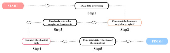 The Isomap algorithm is based on Multidimensional Scaling (MDS) analysis. Its basic idea is to use the geodesic distance between data points to describe the geometric properties between data, and on this basis, it establishes a mapping relationship between the geodesic and downscaled data and the original data, so as to downscale the high-dimensional data [23,24]. The Isomap-based L-Isomap algorithm, which is faster, can better express the low-dimensional characteristics of the high-dimensional data. Let the number of samples be N and Landmarks be n (n << N); if the target dimensionality reduction is d, then Landmarks is only larger than d + 1. The calculation steps of L-Isomap are as follows (the flow of data processing is shown in Figure 1).