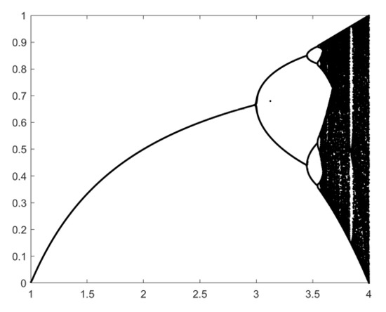 where (0, 4], k is the number of iterations, and (0, 1). With the initial value of x0, the premise of the chaotic state is that takes [3.5699, 4.0] and the sequence of chaotic states is randomly non-convergent. As varies, the distribution of the logistic chaotic sequence is shown in Figure 2.