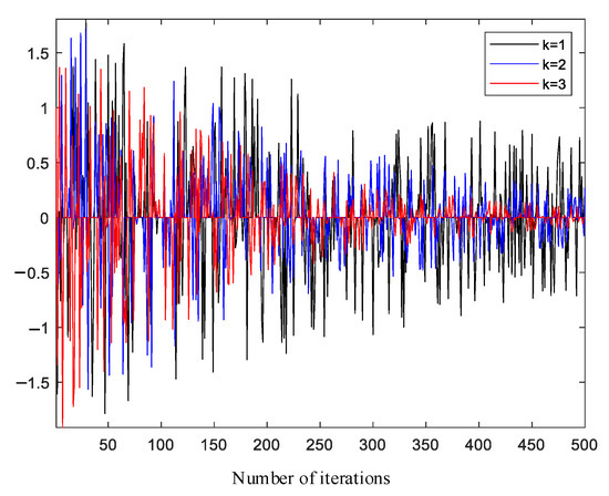 where: is a random integer and [−1, 1]; r is a random function of r; [0, 1]; and [1, 3]. The larger is, the smaller the decreasing , and the opposite is true when is larger. A comparison of the original and the water wave dynamic factor with the number of iterations is shown in Figure 4 and Figure 5: