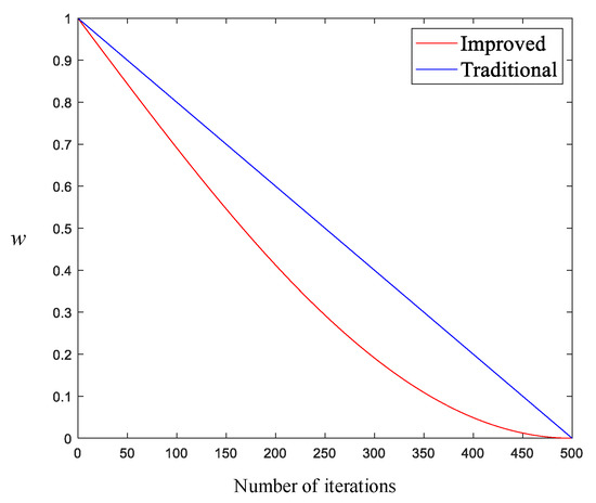 Suitable inertia weights can effectively coordinate the transition between the global search and local exploitation of the algorithm, and can improve the convergence speed and the accuracy of the algorithm’s search for the objective optimization function. The sand cat performed a local search according to Equation (7) when performing a local search for the optimum. In this region, when the sand cat searches according to the vicinity of Equation (7), it can only search for an optimum near the optimal solution and cannot perform better optimization. For this reason, a new weighted adaptive algorithm is introduced in this paper, which enhances the local optimization of the sand cat using the minimum adaptive weighting to adjust the current best sand cat position as it approaches the target. The adaptive weighting formula is shown in Equation (13) and the improved formula of Equation (7) is shown in Equation (14). Figure 6 shows a function image of the inertia weight before and after improvement.