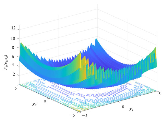 Two single-peak test functions and one multi-peak test function were selected for simulation experiments to validate the optimization search effect of the ISCSO algorithm. The algorithms were compared with the standard SCSO algorithm, the whale optimization algorithm (WOA) [30], the grey wolf optimizer (GWO) [31], and particle swarm optimization (PSO) [32]. The number of iterations for all algorithms was 500, each group of algorithms performed 30 independent optimization tests for each test function, and the optimal value, the worst value, the mean, and the standard deviation were calculated separately. The experimental results are shown in Table 1. The test functions are shown in Figure 7, Figure 8 and Figure 9, with the following equations.