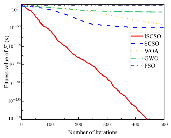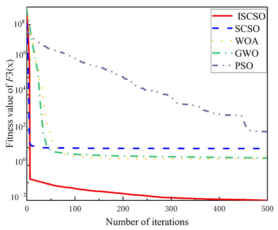 As can be seen in Figure 10, Figure 11 and Figure 12, ISCSO requires the smallest number of iterations for several algorithms to converge to the same accuracy. It shows that the introduction of multiple methods increases the proportion of high-quality individuals in the population and improves the convergence speed of the algorithm. The convergence curves of the WOA, GWO, and PSO algorithms flatten out with increasing iterations, with varying degrees of stagnation and relatively low accuracy in the search for optimal solutions.