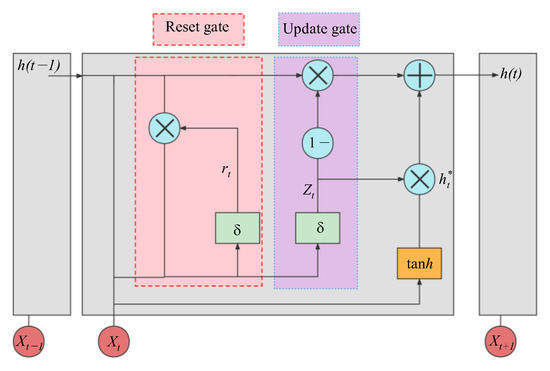 In early 2014, the gated recurrent unit neural network [33] (GRU) was proposed by Cho et al. In the development and improvement of RNN-LSTM-GRU, GRU inherited the advantages of the RNN model in time series computation and of the LSTM model in correlation fusion between data. It also combines the forgetting and input gates in LSTM into an “update gate”, which shortens the computation time and improves the computation efficiency by simplifying the model structure and reducing the training parameters, avoiding the problem of gradient explosion during LSTM computation. The network structure of the GRU model is shown in Figure 13, where A represents the sigmoid activation function.