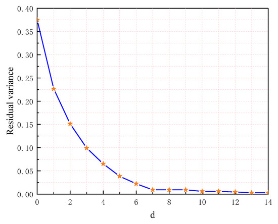 As can be seen in Figure 17, the residual variance decreases with the increase in the dimension of the feature data. When the number of dimensions d increases to 7, the residual variance is 0.0092 and stays at around 0.01. As the dimension increases, the residual variance tends to decrease, and then, smooth out, and the fluctuation also tends to smooth out at this point. This determines that the characteristic data dimension d is 7.