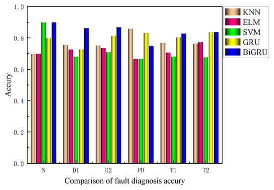 To illustrate the computational stability of BiGRU, 100 samples were randomly selected from a sample set of 465. They were divided into a training set and a testing set according to a 2:1 ratio, and then, these training samples were used to train different models, and the results were tallied. As can be seen in Table 10, the average accuracy of transformer fault diagnosis using BiGRU is 0.8502. In comparison with the traditional five main monitoring learning models, the power transformer fault diagnosis model using BiGRU is found to have the highest average accuracy. In terms of time consumption, the time consumption of fault diagnosis models based on deep learning methods is generally higher than that of machine learning methods. However, in comparison, BiGRU has the highest accuracy rate of all the methods. Although machine learning is easy and fast to use, the accuracy rate is low and does not meet the needs of today’s industry. In comparison, BiGRU has the highest accuracy and takes only a little more time than ELM and SVM. All things considered, BiGRU is the best fault diagnosis method in terms of the practical engineering performance of all the methods involved in the comparison.