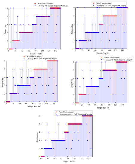 A total of 154 sets of test sample data were used for test training. The features based on L-ISOMP screening were input to BiGRU for diagnostic accuracy experiments of the fault diagnosis model. The ISCSO classification results were compared and analyzed with the SCSO-, WOA-, GWO-, and PSO-optimized BiGRU diagnostic results. The diagnostic results of each method are shown in Table 11, and the classification accuracies are shown in Figure 21 and Figure 22.
