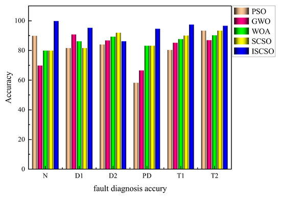 As can be seen in Figure 20, PSO converges the slowest and has the lowest fitness value, reaching convergence after 55 iterations and converging the slowest. WOA improves diagnostic accuracy and convergence speed compared to PSO and GWO, reaching convergence after 32 iterations. The traditional SCSO algorithm is optimal after 31 iterations, resulting in poor local optimization performance due to its poor global optimization performance. In contrast, the improved ISCSO reaches convergence after 15 iterations and has the best adaptivity. This shows that the algorithm outperforms the other four methods in terms of global search performance and convergence speed.