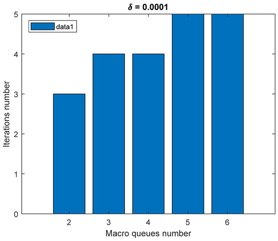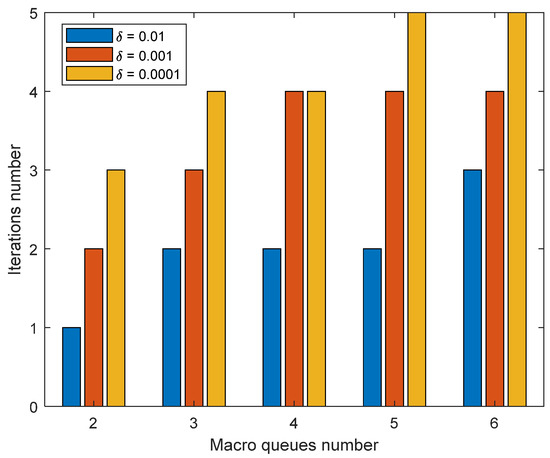 With a decrease in the accuracy requirements of condition (11), the iteration number slightly decreased by an average of 20% to 30% (Figure 5). However, this did not significantly change the nature of the bandwidth allocation among the macro-queues or among the individual sub-queues: the difference in the final decisions ranged from 0.55% to 1.1%. Thus, the proposed method demonstrated reasonably fast convergence within the proposed numerical examples from one to five iterations.