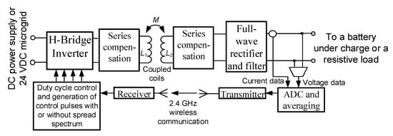 For the experimental studies, a scaled-down 50 W laboratory prototype of a wireless battery charger was designed and physically built. The prototype together with the measurement equipment is demonstrated in Figure 2. A block diagram and simplified schematic diagram of the designed wireless battery charger are depicted in Figure 3 and Figure 4, respectively.