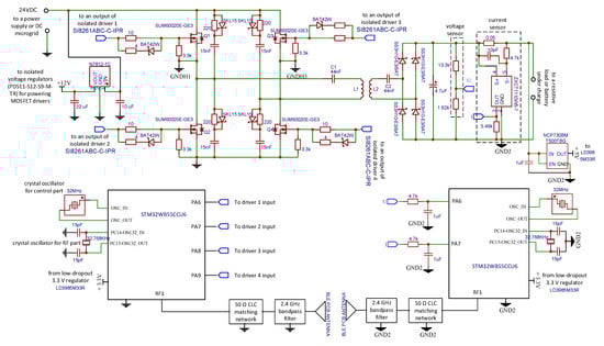 The designed wireless battery charger primary side has an H-bridge inverter (with four surface-mount transistors having low-drain-to-source resistance), four RCD snubber circuits, four isolated MOSFET drivers (with some auxiliary external components), two polymer film capacitors connected in parallel (with low equivalent series resistance) for the series compensation, four isolated step-down switch-mode power converters (with same external components) for powering the drivers, one switch-mode step-down converter to convert input voltage 24 V to output voltage 12 V, a relatively inexpensive microcontroller (with internal transceiver circuit) STM32WB55CCU6, with some external components (e.g., crystal oscillators), the transmitting coil L1 and PCB antenna (Figure 4). The secondary side of the charger is more compact, and it has the receiving coil L2, two polymer film capacitors connected in parallel (for the series compensation), full-wave rectifier with Schottky diodes followed by the filtering capacitor, as well as current and voltage sensors. The control part of the secondary side is represented by the same microcontroller (with some external components) as in the primary side and PCB antenna. The secondary-side microcontroller is necessary to: (1) gather data from the output sensors every 10 ms; (2) make analog to digital conversion; (3) average a set of ten measurement results; (4) prepare data for the transmission; (5) generate a modulated 2.4 GHz signal for Bluetooth low energy (BLE) communications. The primary side microcontroller receives the data due to the wireless communication link between it and the secondary-side microcontroller, and then, the primary-side microcontroller completes the following actions: it computes the duty cycle of the MOSFETs control signals (by using digital PID controller), and it generates four square pulses with definite duty cycles to control the MOSFETs and to regulate the charger output voltage or current. In addition, the primary side microcontroller is necessary to toggle from COC to COV mode (if the output voltage is equal to cut-off charge voltage 25.2 V), to switch-off the charging process if the output current < 200 mA and to implement the multi-switching frequency technique with different parameters. A suitable code is recorded to a memory of the microcontrollers to implement COC or COV modes and the multi-switching-frequency schemes.