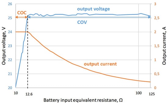 The designed and fabricated wireless battery charger’s output voltage and current were measured for different values of the load resistances (11.1 Ω–126 Ω). As it is seen in Figure 6, the charger performs well because COC and COV modes are achieved: the charging current is almost constant (approximately 2 A) in COC mode, and the charging voltage is also almost constant (approximately 25.2 V) in COV mode. When the load resistance equals 12.6 Ω, then the charger toggles from COC mode to COV mode. The charging profiles are similar for the charger without the multi-switching frequency scheme or with it.