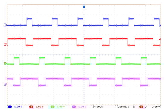 Waveforms of the control signals of MOSFET Q1 (blue), MOSFET Q2 (red), MOSFET Q3 (green) and MOSFET Q4 (bottom) when the load resistance is 40 Ω and without the spread spectrum. Scale: 4 µs/div; 5 V/div.