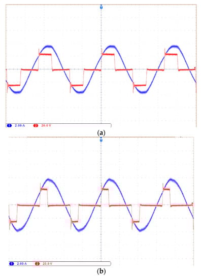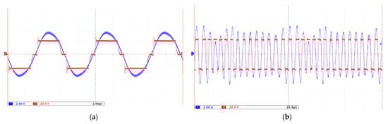 The output voltage (red) and current (blue) waveforms of the H-bridge inverter: (a) the load resistance is 20 Ω; (b) the load resistance is 40 Ω. In both cases, the spread spectrum is not used. Scale: 2 A/div; 20 V/div; 2 µs/div.