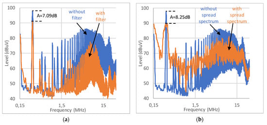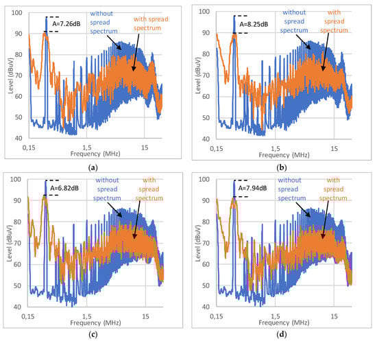 The main comparison of the performance characteristics of the wireless battery charger without the multi-switching frequency technique with that of the wireless charger with the multi-switching frequency technique (for different cases) is presented in Table 2, Table 3, Table 4 and Table 5. Additionally, a comparison of the conducted emissions spectra of conventional charger (without the spread spectrum) and the charger with the multi-switching frequency technique is presented for different cases in Figure 10. Attention should be paid to the results presented in Table 4, because if the load resistance is 18 Ω and the lateral misalignment is the maximum (1 cm), then the maximum conducted emission level is the highest. The reduction coefficient (A) of the conducted emissions is calculated as the difference (expressed in dB) between maximum level of the emissions for the charger without the spread spectrum and the charger with the spread spectrum (with the multi-switching frequency technique) within the frequency range 0.15–30 MHz (see Figure 10).