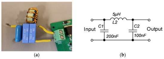 In order to estimate the level of the reduction of the volume of the wireless charger primary side, a conducted emissions filter (Figure 11) was developed with the coefficient of the reduction of the conducted emissions (A) similar to that of the optimum three-switching frequency technique. The filter volume was about 10% of the total volume of the primary side of the charger. The main results are presented in Figure 12 and Table 6 for a comparison of the performances of the wireless charger with different cases (without the filter and the spread spectrum; with the filter but without the spread spectrum and without the filter but with the multi-switching-frequency technique). We concluded that the volume of the primary side of the wireless battery charger can be reduced noticeably (by at least 10%), with slightly better efficiency and reduced cost of the charger, if the proposed optimum multi-frequency technique is used.