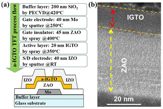 (a) Fabrication process flow of IGTO TFT on a glass substrate and schematic representation of the cross-sectional view of IGTO TFT. (b) Cross-sectional transmission electron microscopy (TEM) image of spray pyrolyzed IGTO/ZAO stacked film.