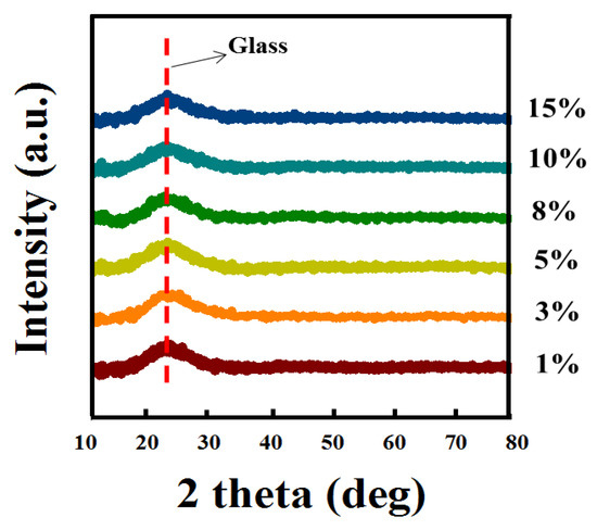 XRD spectra of the IGTO films deposited at a substrate temperature of 350 °C by spray pyrolysis, where Ga concentration varied from 1 to 20%. The peak at 25° is related to glass.