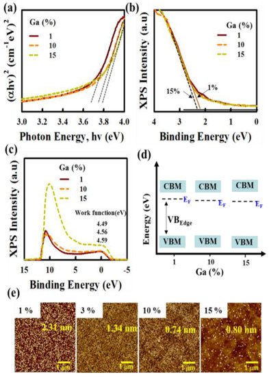 The optical bandgaps of IGTO films (Ga: 1 to 10%) are shown in Figure 3a. For UV-Vis measurement, the a-IGTO films were deposited on the glass (Corning eagle), where the glass absorption can be negligible [2,22,23,24]. The increase in bandgap with an increase in Ga ratio in IGTO from 3.62 (1% Ga) to 3.69 eV(10% Ga). The bandgap of IGTO is higher than that of ITO (3.19 eV) due to a higher bandgap of GaO (4.8 eV) [3,6,10]. The optical bandgap, Eg, was extracted using the relationship: αhν = A (hν − Eg)1/n, where α, hν, A, and n are the absorption coefficient, photon energy, a proportionality constant, and optical transition exponent in the absorption process, respectively. XPS valance band spectra of IGTO ((Ga: 0 to 15%)) films measured are shown in Figure 3b. The Fermi energy level (EF) shifts from 2.44 (1% Ga) to 2.27 eV (15% Ga) above the valence band edge, as shown in Figure 3b. To achieve the accurate Fermi-level position, the Ultra-violet photoelectron spectroscopic (UPS) experiment was conducted for the IGTO thin films with different Ga fractions. The work function (Φ) values for IGTO films with the different (1, 10, and 15%) Ga ratios are 4.49, 4.56, and 4.59 eV, respectively. With increasing Ga incorporation Fermi level shifts away from the conduction band (CB) as shown in Figure 3c. This indicates the shift of EF toward the valance band (VB) edge, as shown in Figure 3d. The energy difference between the Fermi energy level (EF) and the conduction band (CB) edge for IGTO is 1.18 eV (1% Ga) and 1.44 eV(15% Ga). Note that the general trend for the electron concentration in the oxide semiconductor decreases with an increase in Ga doping ratio in IGTO [12,13,14,25]. The surface morphology of spray pyrolyzed IGTO film can be seen in Figure 3e. The root means square roughness (RRMS) for 1, 3, 10, and 15% Ga-doped IGTO films are 2.31, 1.34, 0.74, and 0.81 nm, respectively. With the increase in the Ga ratio in the IGTO film, the surface roughness became smoother. The smooth surface morphology of the IGTO film could provide a good interface with the gate insulator. Therefore, these results confirm that an appropriate Ga ratio in IGTO film could enhance the electrical characteristics of IGTO TFT.