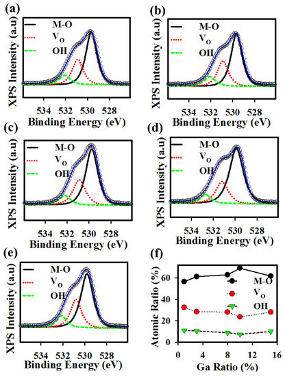 To elucidate the physical mechanism, we studied and compared O1s XPS spectra for the chemical bonding analysis of the a-IGTO films by varying Ga ratios as shown in Figure 4a–f. The O1s spectra are deconvoluted into three regions with the binding energies centered around ~529 eV (M-O-M), ~531 eV (Vo), and ~532 eV (−OH), respectively. The M-O m percentages in IGTO films with different Ga ratios (1, 3, 8, 10, and 15%) are 56.67, 61.16, 63.01, 69.22, and 61.86%, Vo ratios are 32.34, 28.42, 28.12, 23.59, and 28.11%, and the −OH ratios are 10.99, 10.42, 8.87, 7.19, and 10.03%, respectively. M-O m bonds, fewer oxygen-related defects (VO + OH) were obtained in Ga (10%) case compared to the others. The decrease in Vo is compensated by a higher M-O-M ratio [12]. The percentages of M-O, Vo, and -OH of O1s peak summarized in Figure 4f and Table S1.