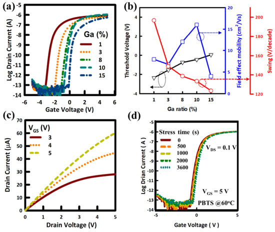 To test the electrical stability of the IGTO TFT, the PBTS (at VGS = 5 V for 1 h) on the TFT performances was investigated. The evaluation of the transfer curve of IGTO TFT under PBTS for 1 h, shows the threshold voltage shift (ΔVTH) of less than 0.4 V, as can be seen in Figure 5d. Small VTH shift indicates fewer electron traps at the interface between the gate dielectric and the semiconductor channel layers [5,10,13,14,16]. The interfacial trap density was calculated for the IGTO TFT at different stress times from 0 to 3600 s; negligible change in trap density obtained after 1 h of bias stress is shown in Figure 4d. Note the insignificant change in SS even after bias stress because of fewer trap states at the interface [2,3,10,11,12,13,24,25,26,27]. Comparison of the electrical properties of oxide TFTs using spray pyrolysis appears in the literature [17,18,19,20,21,26] (Table 1). The improvement in the electrical properties is due to its better interface quality with the GI because of fewer interfacial defects [25,26]. Therefore, it is concluded that the better electrical properties of IGTO TFTs can be achieved by optimizing the Ga ratio.