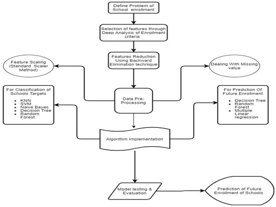 This study is divided into two sections. The first section includes different models for predicting school enrollment, such as Random Forest Regression, Decision Tree Regression, and Multiple Linear Regression. Enrollment is based on essential student characteristics. Pre-processing techniques extracted useful information from collected raw data. For feature reduction, backward elimination is used. Stratified shuffled split is a data splitting technique that uses cross-validation. Train the model on multiple machine learning algorithms and analyze the best model to predict future enrollment. The highest Regressor model is the Random Forest Regressor having with an accuracy of 97.1%. The second part contains the classification of schools into three categories. The Random Forest classifier has the highest accuracy (94%), whether the school is on target, below target, or far from the target. The goal is to determine which schools will be on track or not in the coming academic year. This research significantly improves literacy and allows for the implementation of specific initiatives for low-performing schools ahead of schedule.