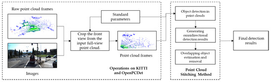This section presents the 3D point cloud stitching method for object detection. Existing studies usually crop the full-view point clouds to front-view point clouds to decrease the overall processing and training time. The methodology in this paper aims to create a single detection range that is larger than the FoV of common approaches. The stitching method is a combination of three modules (3D object detection, generating omnidirectional results, and overlapping object removal) to solve the problem of applying autonomous driving datasets and models for roadside perception tasks.