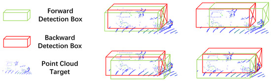 This estimation and removal method is not only adding S1 and S2, but it focuses on the problem of multiple detections of the same object across different FoVs (near the seam). When objects pass the front and back regions, point clouds are split into two parts. The PointRCNN can detect the positive object in each part. However, detection results are a false positive for the omnidirectional FoV, which leads to the problem with repeated detection. Then the same target will appear in S1 and S2 simultaneously, as shown in Figure 4.