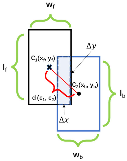 where C1 (xf, yf) and C2 (xb, yb) are center points from forward and backward detection boxes. It is apparent that overlapping areas can reduce length or width of no overlapping parts. Specifically, overlapping parts at different angles still reduce the bounding box size of no overlapping parts. The length and width between no overlapping boxes are always larger than overlapping boxes as shown in Figure 5.