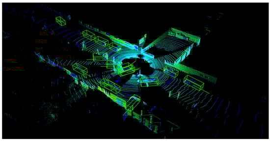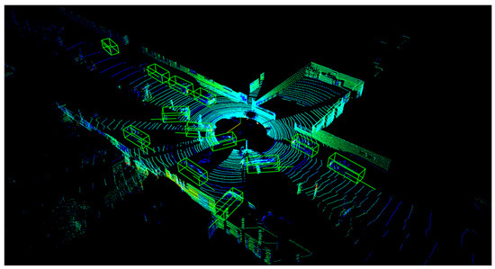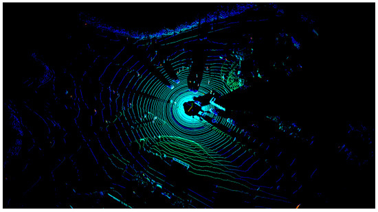 The KITTI dataset was proposed by Karlsruhe Institute of Technology and Toyota Technological Institute in Chicago to support 3D object detection, 3D tracking, optical flow, and visual odometry tasks. The classes of raw data set are divided into three categories including: ‘Car’, ‘Pedestrian’, and ‘Cyclist’. Raw point cloud data are shown in Figure 6. According to the occlusion and truncation levels, the dataset was grouped into three difficulty levels (easy, moderate, and hard) for each category. The minimum height of the bounding box in easy difficulty level is 40 Px, and the maximum truncation degree is 15%. In the moderate difficulty level, the minimum height of the bounding box is 25 Px, and the maximum truncation degree is 30%. The minimum height of the bounding box in hard level is 25 Px and the maximum truncation degree reaches 50% [43]. The KITTI dataset was divided into 7481 training samples and 7518 testing samples. The PointRCNN in this paper was trained for 500 rounds with an initial learning rate of 0.01, and the batch size was 2.