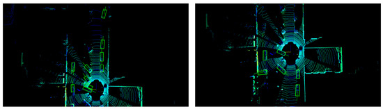 It is obvious that detection results are in the same environment and sensor location, but the detection range is different, therefore making the stitching method necessary. Coarse stitching was made for two sets of point clouds as in Figure 9. The results from the same coordinate system were combined in a set of the omnidirectional detection results. Compared with the previous approaches, the stitching method obtained more detection results to be merged, but no additional point clouds were added. Specifically, more detailed and valid objects can be detected at 360° by base model that was trained by labeled targets. The stitching method in this paper is an effective way that can further expand detection range by associating results to the same coordinate system. It should be noted that overlapping targets were added near the stitching. By utilizing estimation and removing methods, the CDIoU of each of bounding boxes could be calculated. The final stitch data are shown in Figure 10, where each object is highlighted by a green bounding box. It shows that the proposed method can stitch the point cloud correctly based on detection results. The redundant information is removed successfully by multi-detection on the same frame, and the true positive results with higher confidence scores are retained completely. A smooth transition is realized when the same target crossed FoVs, and it can generate more meaningful results for roadside perception.