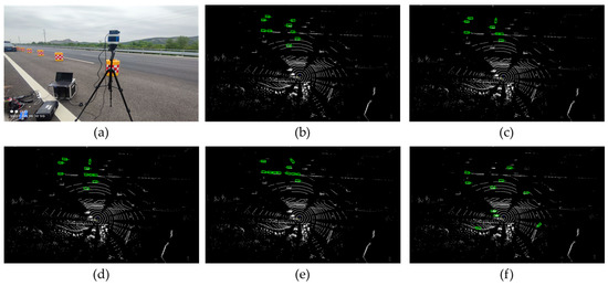 In addition, the roadside LiDAR was temporarily installed on a tripod for this study, as shown in Figure 11a. The detection results are also described by green bounding boxes in Figure 11b–e. Meanwhile, multiple existing methods (PointRCNN [36], PV-RCNN [34], SECOND [7] and Part-A2-Free [45]) were tested on same collected point cloud data, respectively. In Table 5, the performances of different detection algorithms with training time, running time, detection range, AP and output objects were further compared. The AP (3d) under easy conditions for the car class was selected to represent the accuracy level of models. All the algorithms showed similar performance in the AP, but the proposed method (88.9404) is higher than SECOND (88.6137). The training time of ours is lower than most of the methods, which means an effective detection model can be obtained for roadside perception as soon as possible. It should be noted that the total training and running time of the proposed method was performed at a similar level with the base PointRCNN. This is because the stitching method was based on PointRCNN improvement, where forward and backward detection can be conducted in parallel with a high efficiency. Omnidirectional detection results can be generated in the same environment without more computational resources such as larger memory consumption. Even though the time this stitching algorithm takes was not shorter than other models, more precise and robust detection was provided, as can be seen from visualization results. In Figure 11b–e, objects can be detected but the cover range was limited to the front FoV. Some close targets with sufficient features were not labeled due to being beyond the range of the front FoV, which cannot meet the needs of roadside perception. In addition, a maximum of 8051 objects were outputted by other models within the limitations of the search range, but it clearly did not properly evaluate the quality of an algorithm. It can be observed that some results are false positive objects in Figure 11b–e, especially the results provided by SECOND and Part-A2-Free. Conversely, our method could output true positive objects, as many as possible, as Figure 11f described. The near, distant and back targets could be included in the detection results. Taken together, the proposed stitching method can support the perception tasks of roadside LiDAR., which could produce more accurate results in 360° FoV with less training time.