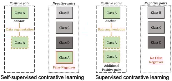 - Khosla, P.; Teterwak, P.; Wang, C.; Sarna, A.; Tian, Y.; Isola, P.; Maschinot, A.; Liu, C.; Krishnan, D. Supervised Contrastive Learning. In Advances in Neural Information Processing Systems; Larochelle, H., Ranzato, M., Hadsell, R., Balcan, M., Lin, H., Eds.; Curran Associates, Inc.: Red Hook, NY, USA, 2020; Volume 33, pp. 18661–18673. [Google Scholar]