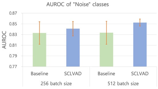 As shown in Table 4 and Table 5, SCLVAD showed a higher TPR and AUROC for all speech classes compared to the baseline. In the case of the baseline, as the batch size increased, the AUROC was similar but the TPR degraded for all speech classes. However, in the case of SCLVAD, both the AUROC and TPR improved as the batch size increased. In addition, the overall standard deviation was further reduced, resulting in improved model stability as the batch size increased. With the proposed SCLVAD method, the AUROC of the MarbleNet for the “All” class was improved by 1.7% with overlapping segments compared to the baseline trained with a batch size of 256, which showed better performance than the baseline trained with a batch size of 512. For the TPR with overlapping segments, the improvements were 2.9%, 4.6%, and 2.7% for the “Noise”, “Music”, and “All” classes, respectively.