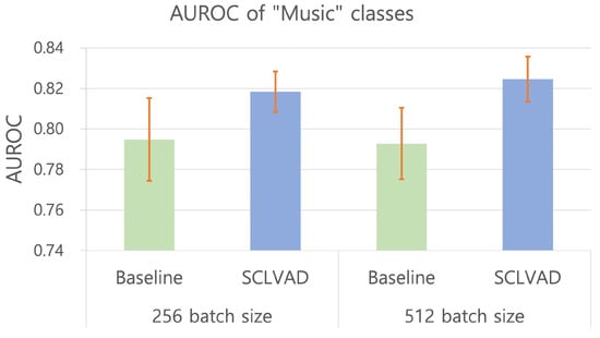 In order to provide a more detailed analysis, we examined the AUROC values, as well as the TPR values, for the “Noise” and “Music” classes when the input segments overlapped by 87.5%. We compared the performance of the proposed method and the baseline method, both of which were trained with batch sizes of 256 and 512, respectively. The results, as shown in Figure 3, indicated that the “Noise” class for the baseline method resulted in similar AUROC average and standard deviation values for both batch sizes. However, the proposed SCLVAD method performed better than the baseline for both batch sizes. Additionally, as the batch size increased, the average value of the AUROC improved and the standard deviation decreased. In the case of the “Music” class, as shown in Figure 4, the results indicated that the proposed SCLVAD method had a superior average AUROC value and a smaller standard deviation for both batch sizes compared to the baseline method. In contrast, the performance of the baseline method decreased when the batch size increased, whereas the performance of the SCLVAD method improved as the batch size increased, which was similar to the results obtained for the “Noise” class.