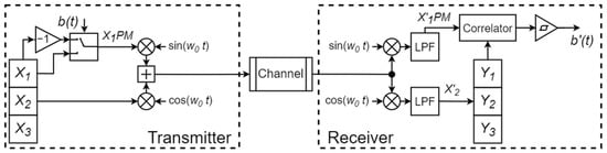 The QCPSK data transmission system in Figure 1 is based on chaos phase-shift keying and quadrature transceiver. The binary message signal b(t) controls a switch that toggles between X1 and −X1. Bit “1” shifts to X1, and bit “0” shifts to −X1, thus forming the phase-manipulated chaos signal labeled as X1PM. The synchronization X2 is the in-phase component, and the information-carrying X1PM is the quadrature component of the transmitted signal. After propagating through the channel, the received quadrature signal is passed to the quadrature demodulator, which separates the synchronization X′2 and information-carrying X′1PM signals with the use of low-pass filters (LPF). In the QCPSK system, the received information signal b′(t) is detected by first calculating the correlation β between the X′1PM and Y1 (Y1 ≈ X1 when synchronized). When detecting “1”, X′1PM positively correlates with Y1 and β > 0. When detecting “0”, X′1PM negatively correlates with Y1 and β < 0. Then the result of a correlator is processed by a comparator that outputs “1” if β ≥ 0 and “0” if β < 0, thus acquiring the received information signal b′(t).