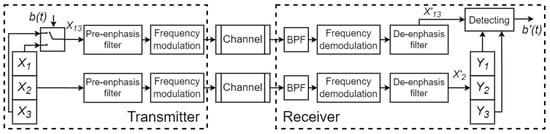 The FM-CSK data transmission system in Figure 2 is based on chaos shift keying and frequency modulation. The binary message signal b(t) controls a switch that toggles between chaos signals X1 and X3 of equal powers. Bit “1” shifts to X1, and bit “0” shifts to X3, thus forming the information-carrying signal X13. The X2 and X13 signals are passed through pre-emphasis filters, and each is used for frequency modulation. Both signals are then transmitted in parallel, propagating through the channel. In the receiver, both signals are passed through a bandpass filter (BPF), frequency-demodulated, and passed through a de-emphasis filter. Using pre-emphasis and de-emphasis filters eliminates noise power spectral density increase with frequency caused by frequency demodulation. The received information signal b′(t) is detected by estimating the correlation between the received X′13 signal and Y1 and Y3. If X′13 correlates with Y1, then the “1” bit is received, and if X′13 correlates with Y3, then the “0” bit is received. As demonstrated in work [53], an appropriate bit length is selected to minimize the correlation between the modulated bits.