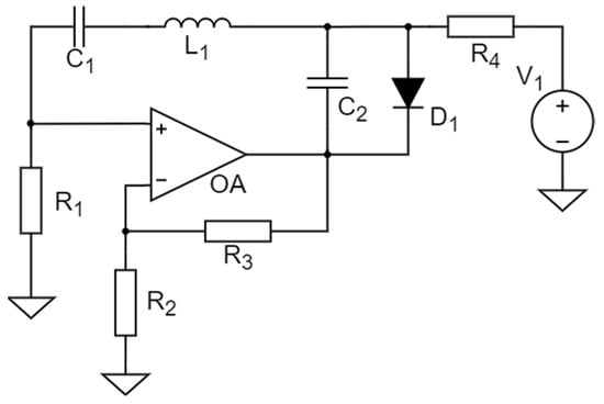 The chaos oscillator selected for the study of the two systems is the Vilnius chaos oscillator [21]. This oscillator was chosen due to the circuit’s simplicity and low power consumption. The circuit diagram of the Vilnius chaos oscillator is given in Figure 3.