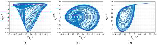 The differential equations show that the state variables of the oscillator are the voltages of the capacitors C1, C2 and the current of the inductor L1. The QCPSK and FM-CSK use and state variables of the oscillator as X1 and X2 (as well as Y1 and Y2). In the case of , the voltage of the R1 is taken as X3, knowing that = . The state variables form a chaotic attractor, and the projections of Vilnius chaos oscillator’s attractor are shown in Figure 4a–c.