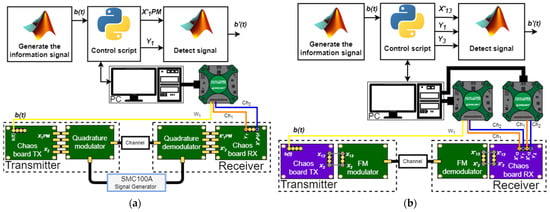 Figure 5a,b show the block diagrams of the QCPSK and FM-CSK hardware prototypes. The figures demonstrate that the chaos oscillators of the transmitter and receiver, modulators, and demodulators are implemented in hardware for both systems. The information signal generation and detection are done in software on a host computer in MATLAB, while a dedicated Python script provides an interface for controlling the Analog Discovery 2 multifunction oscilloscopes. The device passes the generated information signal b(t) to the transmitter and records the chaos signals used then in MATLAB to detect the message signal b′(t).