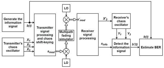 First, the data signal b(t) is created, and the chaos signals of the transmitter’s chaos oscillator are acquired. Then the next step applies chaos shift keying using the b(t) and corresponding chaos signals: phase manipulation of X1 in the case of QCPSK and chaos shift keying between X1 and X3 in the case of FM-CSK. The signals are then used for the transmitter signal processing and modulation following their modulation schemes in Figure 1 and Figure 2. The carrier frequency is shifted to the intermediate frequency (IF) of 140 MHz to ensure consistency of the fading simulator input signals for both systems, which is designated by multiplication with the local oscillator (LO) signal in Figure 6. For this study, the two LOs are synchronous, so the carrier recovery is unnecessary in the receiver. The AWGN of the set signal-to-noise ratio (SNR) is applied to the signals before demodulation in the receiver. The received and processed synchronization signal X′2 is then passed to the receiver’s chaos oscillator, and the chaos signals of the oscillator are acquired. The signals are then used to detect the information signal b′(t), following the schemes in Figure 1 and Figure 2. Finally, the bit error rate (BER) is estimated for several SNR levels of the noise signals and different parameters of the noise channel.