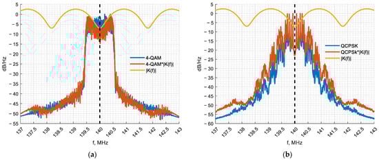 The performance of QCPSK and FM-CSK in selective fading conditions is studied in comparison to 4-QAM and FSK systems. The 4-QAM and FSK are the closest non-chaotic counterparts to the studied chaos-based systems, thus providing a good benchmark. Figure 8a,b show the spectra of 4-QAM and QCPSK alongside the estimated amplitude transfer function |K(f)| of the multipath channel. The figure shows that 4-QAM and QCPSK have the same frequency bandwidth at a –20 dB level. However, in the case of QCPSK, the carrier’s amplitude is smaller than the sideband amplitudes, which is not the case in 4-QAM. This difference causes different notches in the spectra of 4-QAM and QCPSK using the same multipath channel parameters. For this reason, the channels’ depths are configured differently for 4-QAM and QCPSK but result in the same notch for the two signals at 140 MHz frequency.
